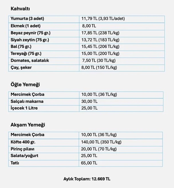 Aşağıda senin alışveriş yaptığın Tarım Kredi Kooperatifinden aldığım fiyatlarla hazırlanan, 3 kişilik bir ailenin 3 öğün yemek listesinin maliyeti var. Sadece temel gıda maddeleriyle karınlarını doyurmalarının, günlük maliyeti 422,31 aylık maliyeti 12.669 TL. Sofraya, bırak senin çok sevdiğin kestane balı, manda yoğurdunu koymayı, öğlenki makarnaya kıyma koyamadık!