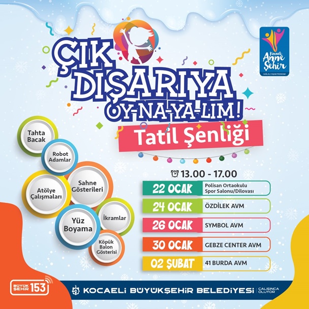 Sağlık ve Sosyal Hizmetler Dairesi Kadın ve Aile Hizmetleri Şube Müdürlüğü’nce hazırlanan ‘Çık Dışarıya Oynayalım Tatil Şenliği’ne tüm Kocaeli halkı davetli. Etkinlikte; sahne sanatçısı cambaz, köpük şov, kukla ile Düşümde Drama etkinliği, karaoke, evet/hayır yarışması, tavada balık sanat etkinliği, parkur-balon patlatma oyunu, zeytin dalı kapı süsü sanat etkinliği, bedenden oyunu, akıl-zekâ oyunları, İngilizce oyun atölyesi ve robot adamların yer alması planlanıyor. Ayrıca etkinliğin gerçekleşeceği merkezlerin fuaye alanlarında da meyve suyu, kek, patlamış mısır stantları kurulacak.