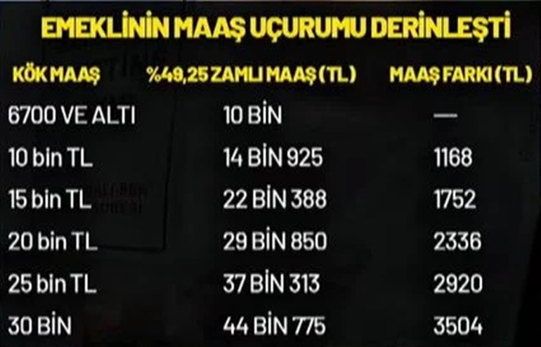 Yurdagülen, “Kim, ne kadar zam farkı alacak” diye sorunca Erdursun, “Kök aylıklarda artışlar yapıldığı için kök aylığı 10 bin liranın altında kalanlar 10 bin lira alacaklar. Yani 7 bin 500 lira alanların maaşları 10 bin liraya tamamlanacak. Dolayısıyla da 2500 lira fark alacaklar. Ama kök aylığa göre %37,57 oranında bir artış yapıldı. Bu artış sonrasında emekli aylıkları emeklilerin hesabına yattı. En düşük emekli aylığı 10 bin lira oldu ancak 7.500 lira olarak yatırıldı çünkü yasal düzenleme yetişmediği için. 7 bin 500 alanlar 10 bin liraya tamamlanacak ayrıca kök maaşına %11,68’lik ilave bir artış yapılacak.