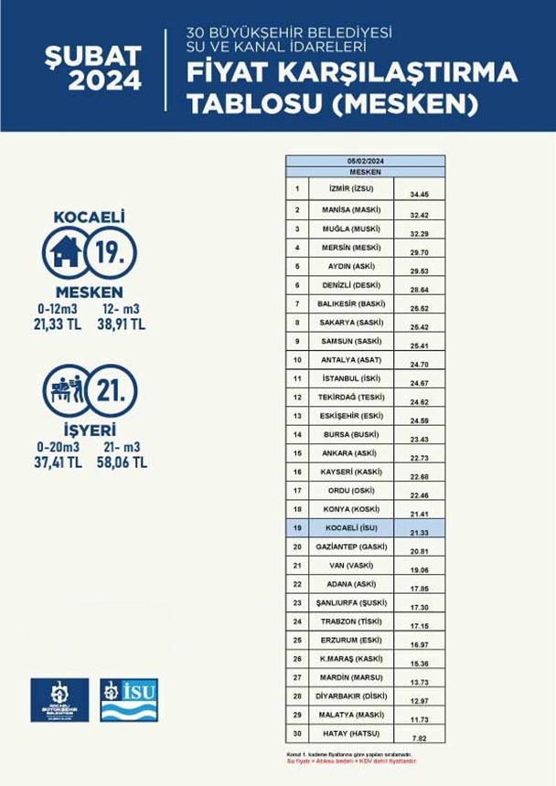 İSU Genel Müdürlüğü bu kapsamda; Kocaeli Büyükşehir Belediye Başkanı Tahir Büyükakın’ın öncülüğünde, geçtiğimiz ocak ayında 2024 Yılı 1. Olağanüstü Genel Kurulu gerçekleştirilerek mesken abonelerinde su fiyatlarına TÜFE oranında uygulanan zam uygulaması durdurulmuş olup aynı zamanda 0-10 metreküp olan 1. kademe uygulaması da 0-12 metreküp olarak düzenlenmiştir. Ayrıca daha önce hanede ikamet eden kişi sayısına göre devam eden kademe uygulaması da Genel Kurul kararı ile 4 kişiye kadar 12 metreküp, 5 kişi 14 metreküp, 6 kişi 16 metreküp 7 kişi ve üzeri olanlara 17 metreküp olarak uygulanmıştır. Alınan Genel Kurul kararı ile konut abonelerimizin ekonomilerine yıllık 614 milyon Türk lirası katkı sağlanmış oldu. İSU Genel Müdürlüğü, mesken (konut) abonelerine uygulanan su fiyatlandırma tarifesinde içme suyu, atık su ve KDV dahil edilmiş fiyatlar göz önüne alındığında 30 Büyükşehir Belediyesi arasında 19. sırada yer alıyor. Ayrıca İSU Genel Müdürlüğü iş yeri abonelerine uyguladığı su fiyatlandırma tarifesinde de ülkemizde yine 30 Büyükşehir Belediyesi arasında 21. sırada yer alıyor.