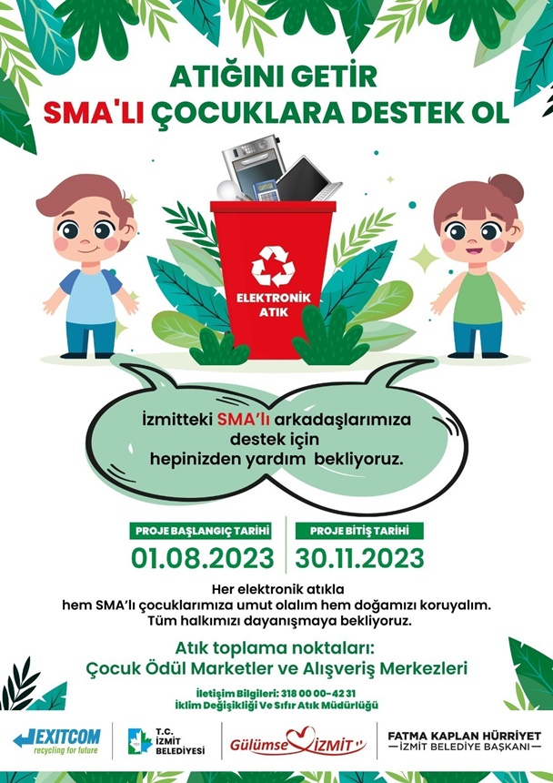 İzmit Belediyesi İklim Değişikliği ve Sıfır Atık Müdürlüğü, Exitcom Recycling ile birlikte anlamlı bir kampanyaya imza attı. ‘Atığını getir SMA’lı çocuklara destek ol’ sloganıyla bir kampanya başlatan İzmit Belediyesi, toplanan elektronik atıkların gelirini iki SMA’lı çocuğun tedavisi için Valilik izni ile başlatılan kampanyaya aktardı.