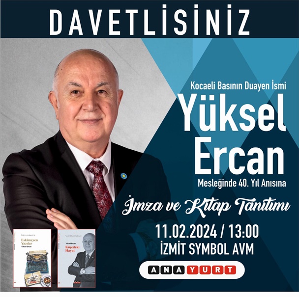 ANAYURT yayınlarından çıkan “Eskimeyen Yazılar” isimli ikinci kitabının imza günü için son hazırlıklarını tamamlayan Yüksel Ercan 11 Şubat 2024 Pazar günü saat 3.00’ten itibaren İzmit D-100 karayolu üzerindeki Symbol AVM’de kitaplarını imzalayacak.