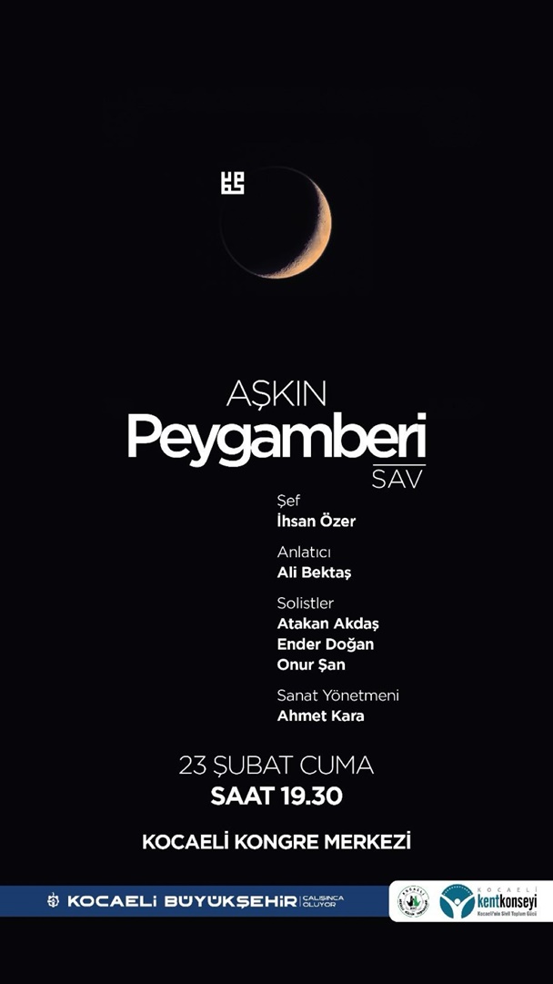 “Aşkın Peygamberi” etkinliği, Berat Kandili’ni ve yaklaşan Ramazan ayını selamlama anlamı taşıyacak. Alemlerin Efendisi için aşkla söylenmiş eserlerden oluşan özel anma programının sanat yönetmenliğini Ahmet Kara yapacak. Programda sanatçılar; Onur Şan, Atakan Akdaş ve Ender Doğan, peygamberimiz için söylenmiş en güzel ilahi, şarkı ve türkülere ses verecek. Koro ve program orkestrası Şef İhsan Özer tarafından yönetilecek. Ali Bektaş, anlatımı ve okuyacağı naatlarla bir edebiyat şöleni sunacak. Program boyunca mevlit, şiirler ve müzik eserlerine eşlik edecek olan özel görsel tasarımlar yapılacak. Geleneksel sanatlardan izler taşıyan bu tasarımlar dev ekranlarda seyirciyle buluşacak.