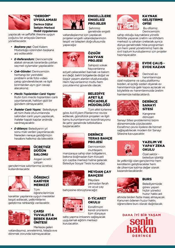 Yatırım, üretim, istihdam, şehrimizin kadınları, gençleri ve engelli vatandaşlarına hizmet etmeyen hiçbir projeyi Derince’nin kaldırma lüksü olmadığını söyleyen Ayvaz, “Bizim belediyecilik anlayışımız billboard ve beton belediyeciliği değil vatandaşlarımızın dertleri ve şehrimizin gerçek problemlerini çözmek olacaktır” dedi.