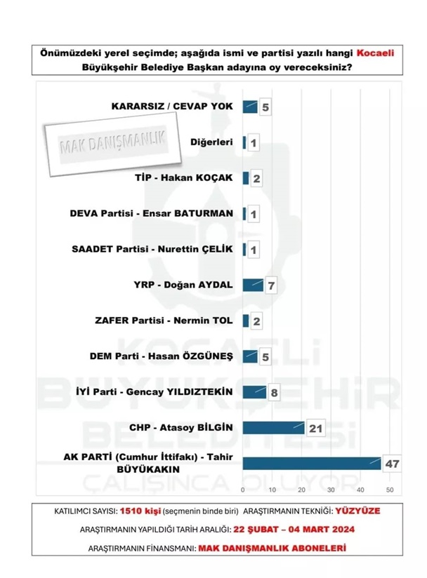 Yerel seçimlerin yapılmasına son 19 gün kala en büyük araştırma MAK Danışmanlık şirketinden geldi. 30 büyükşehirde yapılan araştırma sonuçlarında Kocaeli’deki tabloda gözler önüne serildi.