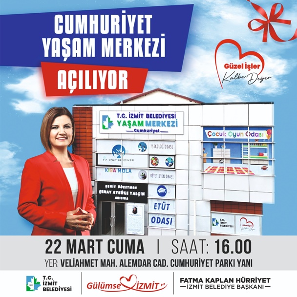 İzmit Belediyesi, kente değer katacak ve birçok fonksiyona ev sahipliği yapacak Cumhuriyet Yaşam Merkezi’ni hayata geçiriyor. ‘İzmit Unutmaz’ vizyonu ile faaliyete geçecek olan Cumhuriyet Yaşam Merkezi, Batman’ın Kozluk ilçesinde 2017 yılında PKK’lı teröristlerce şehit edilen öğretmen Şenay Aybüke Yalçın’ın adını yaşatacak. Veliahmet Mahallesi Alemdar Caddesi Cumhuriyet Parkı yanında yer alan merkez, 22 Mart Cuma günü saat 16.00’da hizmet açılacak.