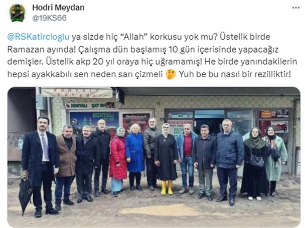 Sosyal medyadan vekile cevap veren bir vatandaş, “Ya sizde hiç ‘Allah’ korkusu yok mu? Üstelik bir de Ramazan ayında! Çalışma dün başlamış 10 gün içerisinde yapacağız demişler. Üstelik AKP 20 yıl oraya hiç uğramamış. He bir de yanındakilerin hepsi ayakkabılı sen neden sarı çizmeli? Yuh be bu nasıl rezilliktir!” dedi.
