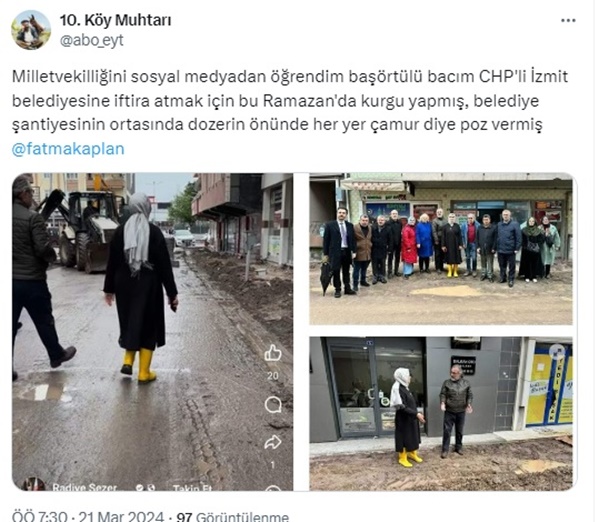 Bir başka vatandaş ise, “Milletvekilliğini sosyal medyadan öğrendiğim başörtülü bacım CHP’li İzmit Belediyesine iftira atmak için bu Ramazan da kurgu yapmış. Belediye şantiyesinin ortağında dozerin önünde her yer çamur diye poz vermiş” ifadelerini kullandı.