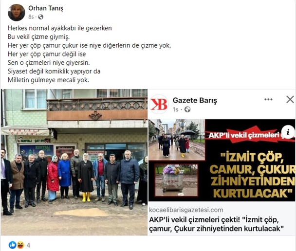 CHP Büyükşehir Belediye Meclis Üyesi Orhan Tanış sosyal medya hesabından yaptığı paylaşımda İzmit Belediyesi için algı üretmeye çalışan AKP Kocaeli Milletvekilli Radiye Sezer Katırcıoğlu’nu eleştirdi. Orhan Tanış paylaşımında, “Herkes normal ayakkabı ile gezerken bu vekil çizme giymiş. Her yer çöp çamur çukur ise niye diğerlerin de çizme yok. Her yer çöp çamur değil ise sen o çizmeleri niye giyersin. Siyaset değil komiklik yapıyor da milletin gülmeye mecali yok” ifadelerini kullandı.