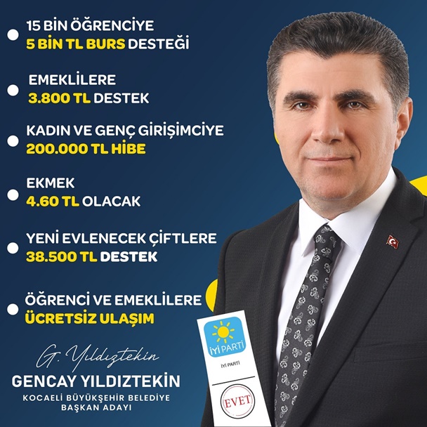15 bin öğrenciye her ay 5 Bin TL burs vereceğini açıklayan İYİ Parti Kocaeli Büyükşehir Belediye Başkan adayı Gencay Yıldıztekin, öğrenci ve emeklilere ulaşımın da ücretsiz olacağını duyurdu. Yeni evlenecek olan çiftleri unutmayan Yıldıztekin, yeni yuva kuracak olan çiftlere 38 Bin 500 TL’lik destek verecek. Kadın ve gençlerin iş dünyasındaki daha aktif rol alması gerektiğini hemen her platformda belirten Gencay Yıldıztekin, kadın ve genç girişimcilere de 200 Bin TL hibe verecek. Yıldıztekin, Kocaelili çiftçilere ise, mazot ve gübre desteği sağlayacağını söyledi.
