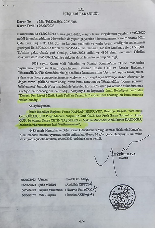 Kurulamamış şirkete iş verdiniz dosyası soruşturma yapıldı. Bakanlıktan gelen yazıda şu yazıyor: İzmit Belediyesi tarafından Kocaeli Fen Lisesi Müzik Sınıfı Tadilatı Yapımı işi kapsamında herhangi bir kamu zararına rastlanılmadığı anlaşıldığından İzmit Belediye Başkanı Fatma Kaplan Hürriyet, ilgi başkan yardımcısı ve ilgili müdürlük çalışanları hakkında soruşturma izni verilmemesine…” Hani ben kurulmamış şirkete iş vermiştim. 6 ay boyunca basın bunu manşet yaptı. Milyonlar aktardı dediler.