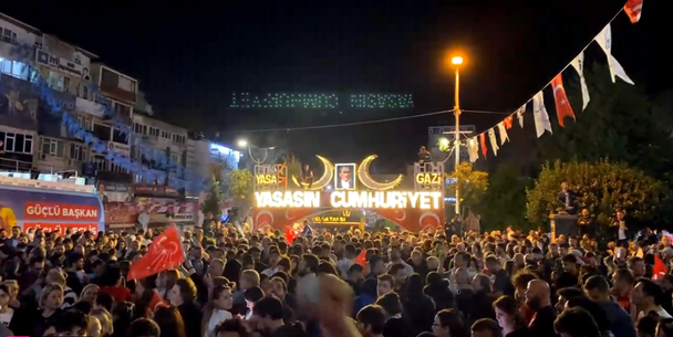 İzmit Belediyesi önünde toplanan binlerce kişi zaferi kutluyor. Başkan Hürriyet de meclis çoğunluğu ile birlikte kazanmanın mutluluğu içinde.