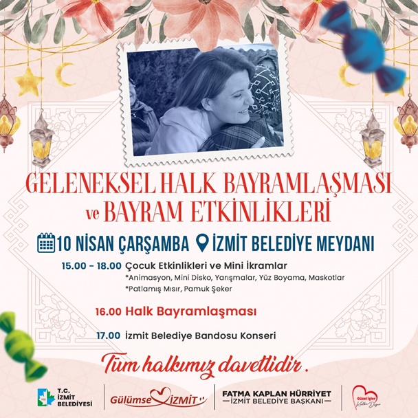 Dini ve milli bayramları ruhuna uygun olarak kutlayan İzmit Belediyesi, her yıl olduğu gibi bu yıl da bayram coşkusunu tüm İzmitlilere yaşatacak. Geleneksel Halk Bayramlaşması ve bayram etkinlikleri 10 Nisan Çarşamba günü 15.00 – 18.00 saatleri arasında İzmit Belediye Meydanı’nda gerçekleşecek. Halk bayramlaşmasının ardından İzmit Belediye Bandosu konser verecek.
