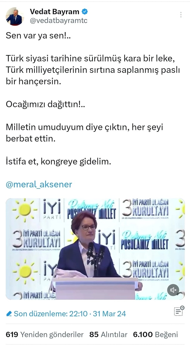 Yerel seçim sonuçlarının deprem yarattığı İYİ Parti'de Meral Akşener'e yönelik tepkiler gelmeye devam ediyor. Seçimlerde büyük bir yara alan İYİ Parti'de Akşener'e bir istifa çağrısı da partinin kurucular kurulu üyesi ve 25. Dönem Milletvekili Vedat Bayram'dan geldi. Bayram sosyal medya hesabından yaptığı paylaşımda, Akşener'e sert sözlerle yüklendi.