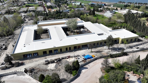 Yapının H, F ve G bloklarında alçı sıva imalatlarına, bina dış cephesinde ise taş yünü montajına devam ediliyor. Çevre duvarı ile altyapı imalatlarına devam edilen merkezin tüm bloklarında elektrik ve mekanik tesisat imalatları sürüyor. Ekipler son olarak sarı avluda bulunan amfinin beton dökümünü gerçekleştirdi.