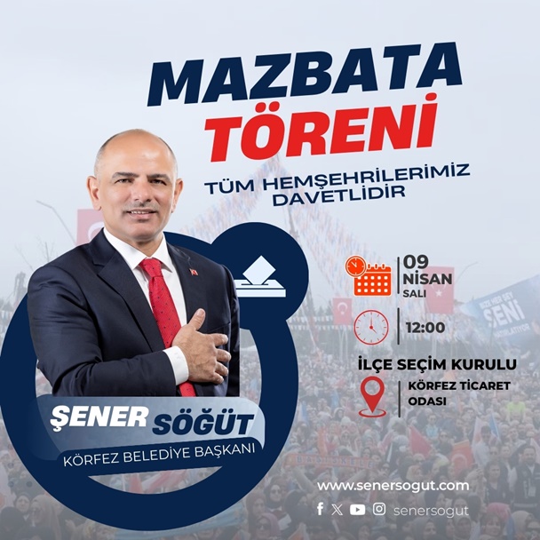 Körfez Belediye Başkanı Şener Söğüt ve belediye meclis üyeleri mazbatalarını yarın (9 Nisan Salı) saat 12.00'de Körfez Ticaret Odası'nda bulunan İlçe Seçim Kurulu'nda alacaktır.