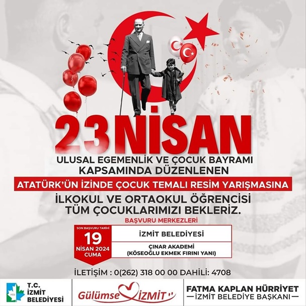 İzmit Belediyesi, her yıl olduğu gibi bu yıl da 23 Nisan Ulusal Egemenlik ve Çocuk Bayramı coşkusunu doyasıya yaşatacak. Kadın ve Aile Hizmetleri Müdürlüğü bünyesinde, ‘Atatürk’ün İzinde Çocuk’ temalı ödüllü resim yarışması düzenlenecek.