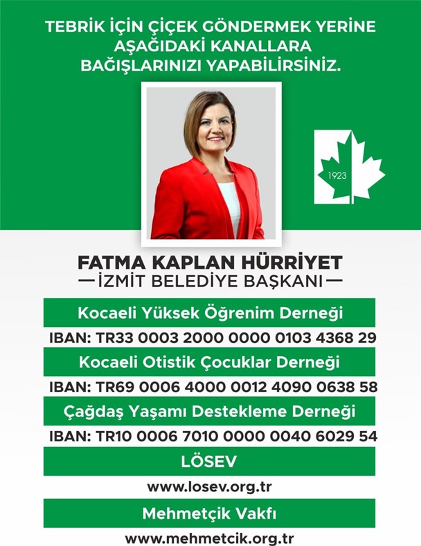 Bugün 2. kez mazbatasını alan İzmit Belediye Başkanı Fatma Kaplan Hürriyet, tebrik amaçlı olarak çiçek göndermek yerine bağış yapın dedi.