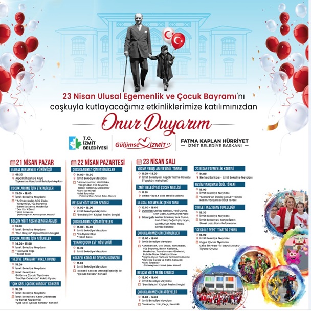 İzmit Belediyesi, her sene olduğu gibi bu sene de 23 Nisan Ulusal Egemenlik ve Çocuk Bayramı’nı büyük bir coşkuyla kutlamaya hazırlanıyor. Kültür ve Sosyal İşler Müdürlüğü bünyesinde hazırlanan kutlama programı 21-22-23 Nisan tarihlerinde İzmit Belediye Meydanı’nda gerçekleşecek.