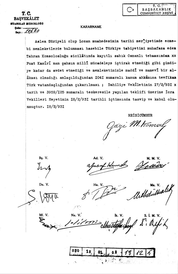Atatürk Milli Mücadele’ye katılmayan ve ülkeye fayda sağlamayan ‘Fuat Kasiri’ isimli Suriyeliyi Türk vatandaşlığından çıkardı..
