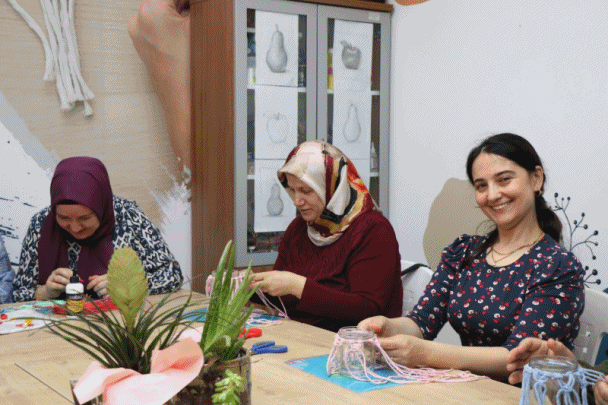 Katılımcılardan Melek Cankurt ise Anne Şehir Merkezi’nde hem spora hem el sanatları atölyesine geldiğini ifade ederek, “Ben burada atölyeye katılırken çocuğum da buradaki okul öncesi eğitim sınıfında. O da orada çok eğlenceli vakit geçiriyor. O mutlu, ben de mutluyum. Ben mutluyum, eşim mutlu. Atma dönüştür atölyelerine katılıyorum. Onlarla gelir kapısı elde ettim. Burada öğreniyorum, evde yapıyorum ve çevreme satıyorum. Emeği geçen herkese çok teşekkür ederim” ifadesini kullandı.