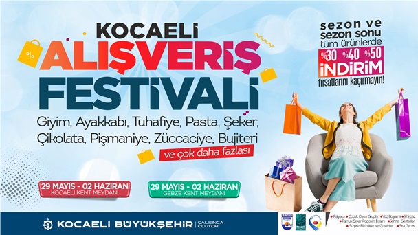 Kocaelili esnafın yüzünü güldürmeyi ve indirimli ürünlerle de vatandaşı buluşturmayı hedefleyen Kocaeli Büyükşehir Belediyesi, Alışveriş Festivali düzenliyor. Kocaeli Alışveriş Festivali 29 Mayıs- 2 Haziran tarihi arasında İzmit ve Gebze ilçelerinde düzenlenecek. Festival kapsamında satışa sunulacak ürünlerde yüzde 50’ye varan indirimler olacak.
