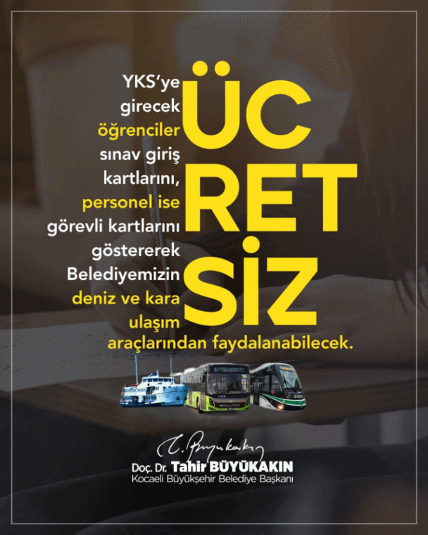 08-09 Haziran günlerinde Türkiye’de Yükseköğretim Kurumlar Sınavı’nda 2 milyonda fazla öğrenci ter dökecek. Büyükşehir Belediyesi, Kocaeli’de YKS’ye girecek 120 bin 195 öğrenci ve görevli personel için ek seferler düzenleyecek. Ayrıca öğrenciler ve görevliler için ücretsiz ulaşım imkanı sağlanacak.