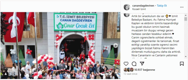 Dağdeviren, açılıştan bir fotoğraf eşliğinde yaptığı paylaşımda, "Artık bir anaokulum da var. İzmit Belediye Başkanı, Av. Fatma Kaplan Hürriyet ve ekibinin İzmit'e kazandırdığı bu güzel okulun ismini taşımak muazzam bir duygu; emeği geçen herkese candan teşekkür ederim," ifadelerini kullanarak, İzmit Belediyesi'ne ve emeği geçen herkese teşekkürlerini iletti.