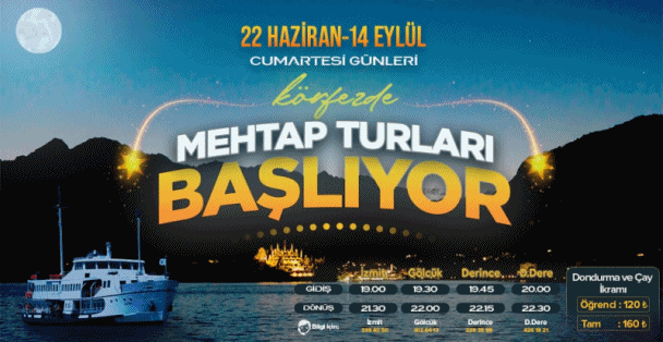 Kocaeli Büyükşehir Belediyesi, Körfez’in muhteşem atmosferinde güzel bir gün geçirmek isteyen vatandaşlara kaçırılmayacak bir fırsat sunuyor. Büyükşehir Belediyesi tarafından yaz aylarında geleneksel hale getirilen ve her hafta sonu gerçekleştirilen “Körfez’de Mehtap Turları” 22 Haziran Cumartesi, Büyük Ada Turları ise 23 Haziran Pazar günü başlıyor. Binişte kent kart veya temassız kredi kartları ile ödemeler gerçekleştirilebilecek.