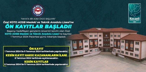 “Hayata bir adım önde başla” sloganıyla 2015 yılında Kocaeli Ticaret Odası tarafından mesleki eğitime kazandırılan Özel KOTO AOSB Mesleki ve Teknik Anadolu Lisesi’nde 2024- 2025 eğitim- öğretim dönemi kayıtları başladı. Öğrencilerine akademik, teknik ve sosyal alanlarda birçok ayrıcalıklar sunan okul, ön kayıt tarihlerini 1- 5 Temmuz 2024 olarak duyurdu.