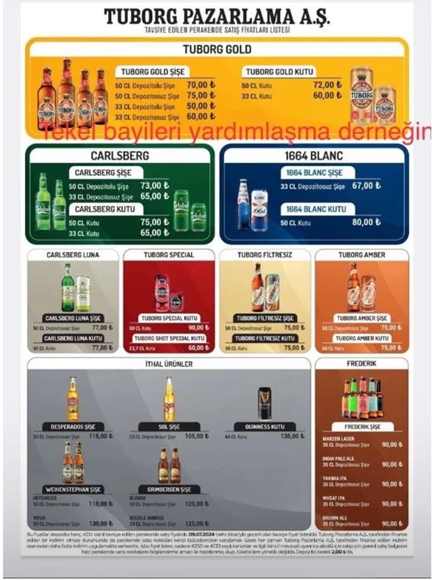 Tekel Bayileri Yardımlaşma Derneği Başkanı Erol Dündar, fiyat listesini sosyal medya hesabından paylaştı. Buna göre grubun en ucuz 50 cc’lik birasının fiyatı 70 TL oldu.