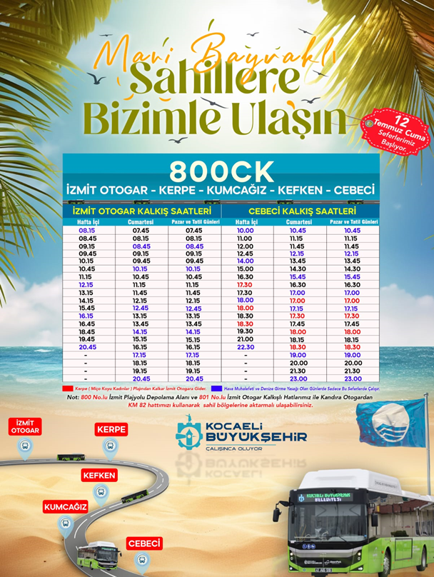 Kandıra sahillerine ilk seferi 12 Temmuz cuma günü yapacak olan 800CK gün içinde toplamda 10 otobüs ile 40 sefer gerçekleştirecek. Kocaeli Şehirler Arası Otobüs Terminali’nden hareket edecek 800CK; Kerpe, Kumcağız ve Cebeci’ye ulaşım sağlayacak. 800CK Terminal’den ilk seferini saat 08.15’de, Cebeci’den ise son seferini 22.30’da gerçekleştirecek.