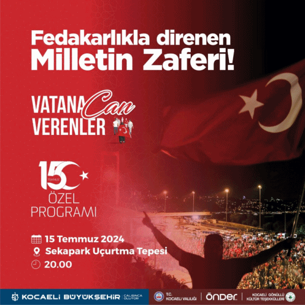Kocaeli Büyükşehir Belediyesi, 15 Temmuz hain darbe girişiminin 8. yılında yine önemli ve anlamlı bir program düzenleyecek. ‘’Fedakârlıkla Direnen Milletin Zaferi’’, 15 Temmuz destanını yeni kuşaklara anlatacak ve ulusal hafızanın tarihsel sürekliliğine hizmet edecek. Özel programda “Vatana Can Verenler” rahmet ve minnetle anılacak.