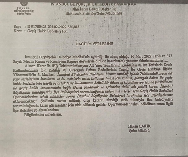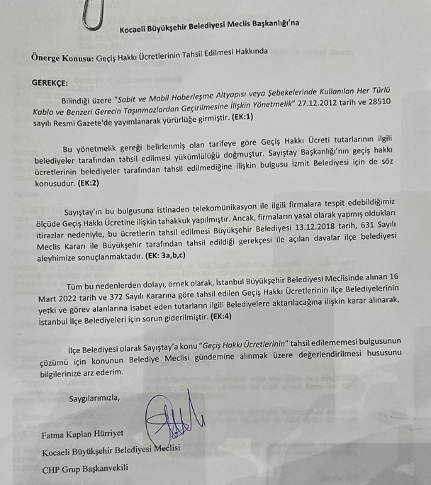 Kocaeli Büyükşehir Belediyesi Meclisi CHP Grup Başkan Vekili olan İzmit Belediye Başkanı Fatma Kaplan Hürriyet, Geçiş Hakkı Ücretlerinin tahsilatıyla ilgili önemli bir önergeyi dün gerçekleştirilen Kocaeli Büyükşehir Belediye Meclisi’ne sundu. Konuyla ilgili olarak tüm ilçe belediye başkanlarına çağrıda bulunan Başkan Hürriyet, şu ifadeleri kullandı: Kocaeli Büyükşehir Belediye Meclisi'ne CHP grubu olarak sunduğumuz önergeyle, haberleşme altyapıları için tahsil edilmesi gereken “Geçiş Hakkı Ücretleri”nin İstanbul Büyükşehir Belediyesi'nde olduğu gibi tüm ilçe belediyelerine adil bir şekilde paylaştırılmasını talep ettik.