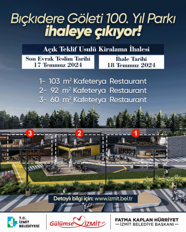 İzmit Belediyesi, yıllarca harabe halde bırakılan Gölkay Park’a yeniden hayat veriyor. Geçtiğimiz aylarda lansmanı yapılan ve yeni adıyla 100. Yıl Parkı Bıçkıdere Göleti" Yeni Nesil Yaşam Alanı olarak bilinen alanda, 1.2 ve 3 numaralı restoran ve kafe alanları ihaleye çıkacak. Bu dükkanlar için belirlenen muhammen bedeller 37,000.00 TL ile 65,000.00 TL arasında değişiyor.