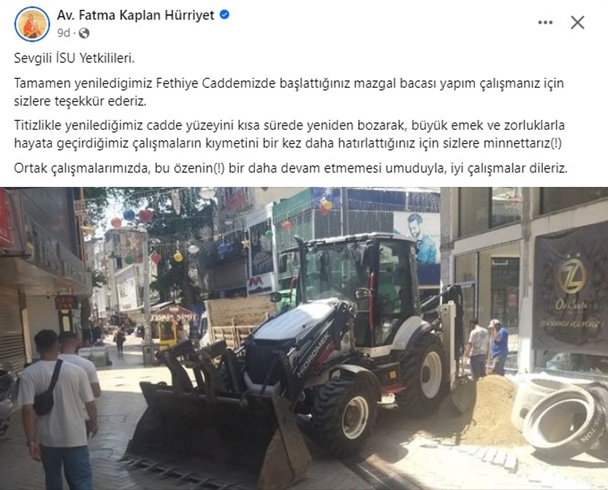 İzmit Belediye Başkanı Fatma Kaplan Hürriyet, 20 yıl sonra yenilenerek kente kazandırılan Fethiye Caddesi’nde mazgal bacası çalışması başlatan İSU’ya seslendi. Sosyal medyadan yaptığı açıklamayla İSU’ya teşekkür eden Başkan Hürriyet, şu ifadeleri kullandı: Sevgili İSU Yetkilileri. Tamamen yenilediğimiz Fethiye Caddemizde başlattığınız mazgal bacası yapım çalışmanız için sizlere teşekkür ederiz.