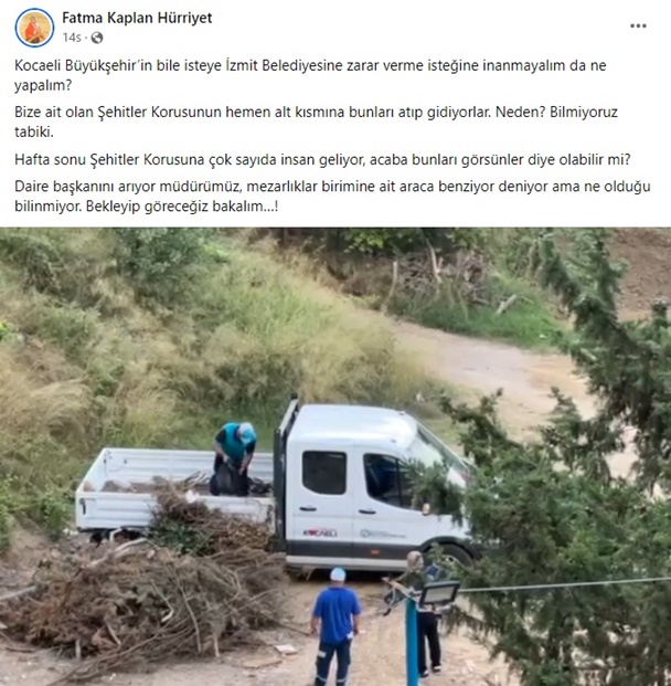 İzmit Belediye Başkanı Fatma Kaplan Hürriyet sosyal medya hesabında paylaştığı videoda Büyükşehir Belediyesinin İzmit Belediyesine zarar verme isteğiyle hareket ettiğini belirterek, “Büyükşehir’in bile isteye İzmit Belediyesine zarar verme isteğine inanmayalım da ne yapalım? Bize ait olan Şehitler Korusu'nun hemen alt kısmına bunları atıp gidiyorlar. Neden? Bilmiyoruz tabii ki. Hafta sonu Şehitler Korusu'na çok sayıda insan geliyor, acaba bunları görsünler diye olabilir mi?"