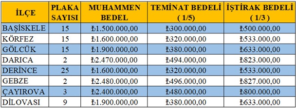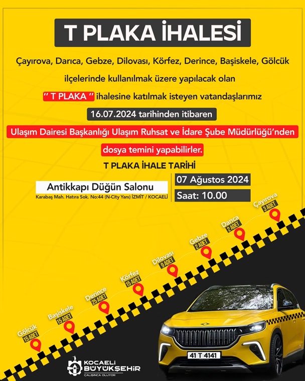 Kocaeli Büyükşehir Belediyesi, vatandaşların ticari taksi ihtiyacını karşılamak amacıyla 8 ilçede toplam 86 yeni taksi plakası verecek. 07 Ağustos Çarşamba günü yapılacak ihaleye katılacakların 06 Ağustos Salı günü saat 17.30’a kadar Ulaşım Dairesi Başkanlığı Ulaşım Ruhsat ve İdare Şube Müdürlüğü'ne dosyalarını teslim etmeleri gerekiyor.