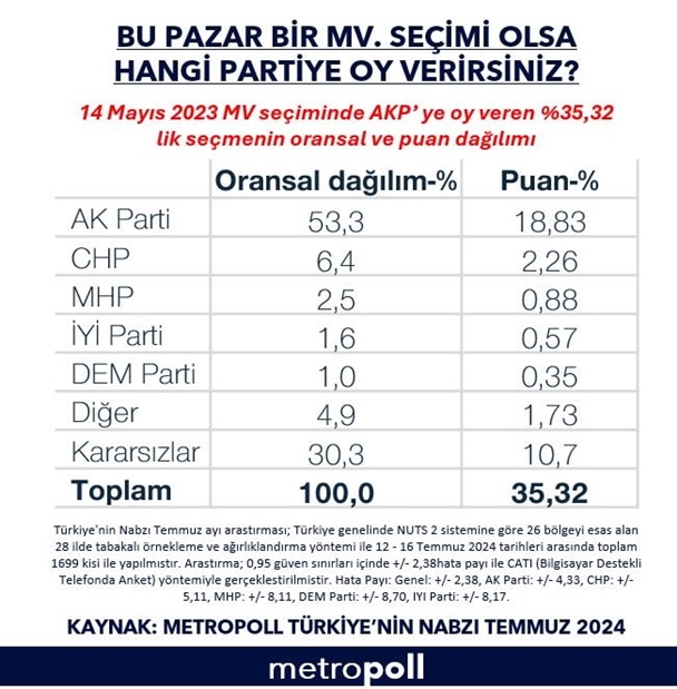 Anket 12-16 Temmuz tarihleri arasında 28 ilde toplam bin 699 kişi ile gerçekleştirildi. Ankette katılımcılara “Bu pazar bir milletvekilliği seçimi olsa hangi partiye oy verirsiniz?” sorusu yöneltildi.