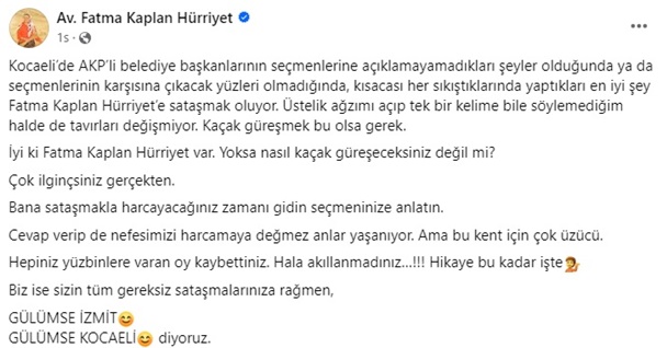 İzmit Belediye Başkanı Fatma Kaplan Hürriyet, sosyal medya hesabından yaptığı açıklamada, AKP’li belediye başkanlarının sıkıştıklarında kendisine sataştığını belirtti. Hürriyet, bu tavrın değişmediğini ifade ederek, " Kocaeli’de AKP’li belediye başkanlarının seçmenlerine açıklayamadıkları şeyler olduğunda ya da seçmenlerinin karşısına çıkacak yüzleri olmadığında, kısacası her sıkıştıklarında yaptıkları en iyi şey Fatma Kaplan Hürriyet’e sataşmak oluyor. Üstelik ağzımı açıp tek bir kelime bile söylemediğim halde de tavırları değişmiyor. Kaçak güreşmek bu olsa gerek.