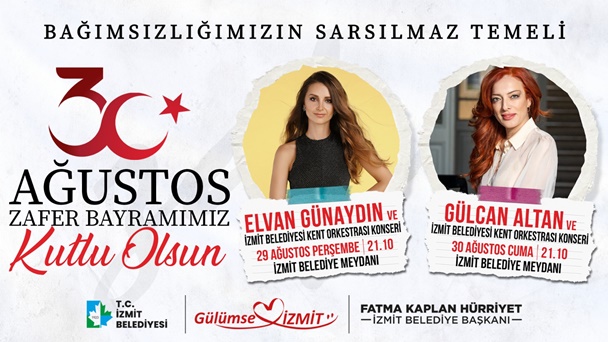 29 Ağustos Perşembe günü saat 21.00’da Elvan Günaydın ve İzmit Belediyesi Kent Orkestrası, İzmitlilerle buluşarak bayram coşkusunu İzmit Belediyesi Meydanı’nda müzikle taçlandıracak. 30 Ağustos günü ise Gülcan Altan ve İzmit Belediyesi Kent Orkestrası, yine Belediye Meydanındaki coşkulu bir konserle halkın bayram sevincini paylaşacak.