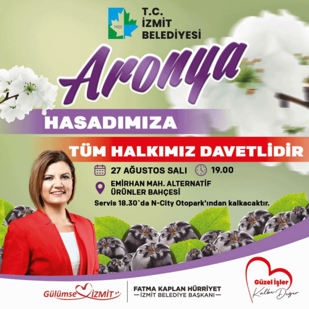 Sağlığa olan faydalarıyla dikkat çeken süper meyve aronyanın hasadı bu yıl da İzmitlilerin katılımıyla yapılacak. Vatandaşlar için saat 18.30’da Ncity AVM otoparkından araç kalkacak. Aronya hasadına tüm İzmit halkı davetli.