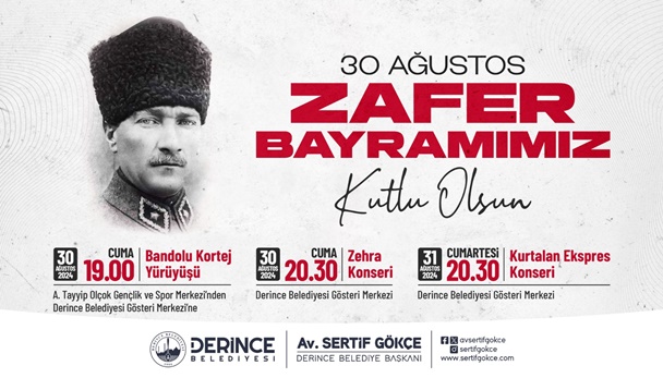 Zafer Bayramı'nın, milletimizin bağımsızlık ve özgürlük mücadelesinin en önemli simgelerinden biri olduğunu belirten Derince Belediye Başkanı Av. Sertif Gökçe de yaptığı açıklamada tüm Derincelileri coşku içerisinde geçecek olan etkinliklere katılmaya davet etti. Derince Belediyesi’nin ücretsiz olarak düzenleyeceği ve iki gün boyunca gerçekleşecek olan etkinlikler Zafer Bayramı’nın coşkusunu daha da pekiştirecek.
