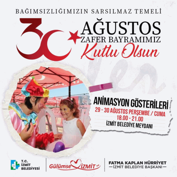 İzmit Belediyesi, 30 Ağustos Zafer Bayramı’nın 102. yıl dönümünü büyük bir coşkuyla kutluyor. Etkinlikler kapsamında bugün İzmit Belediye Meydanında birbirinden güzel etkinlikler düzenlenecek. 18.00-21.00 saatleri arasında çocuklar için renkli ve eğlenceli animasyon gösterileri yapılacak.