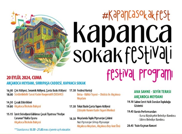 İzmit’in tarihi dokusunu canlandırmak adına İzmit Belediyesi tarafından 20,21 ve 22 Eylül tarihlerinde Kapanca Sokak Festivali gerçekleştirilecek. 20 Eylül Cuma günü 14.30’da başlayacak festivalin ilk gününde birbirinden renkli etkinlikler yapılacak. İzmit Belediyesi, tüm kent halkını ve ziyaretçileri bu eşsiz festivale davet ediyor.