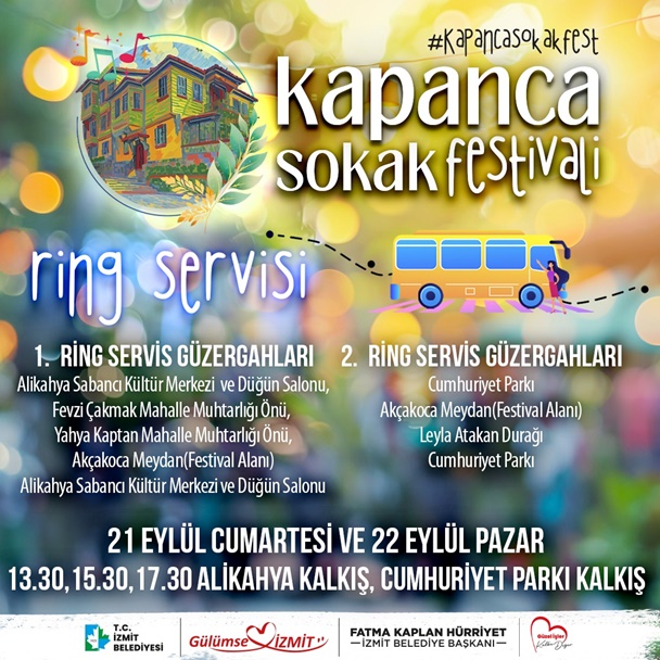 Kapanca Sokak Festivali için hafta sonu boyunca hizmet verecek olan ücretsiz ring servisleri Alikahya ve Cumhuriyet Parkı'ndan 13.30-15.30-17.30 saatlerinde kalkacak. İzmit Belediyesi tüm vatandaşları kentin tarihi dokusunu yansıtan bu anlamlı festivale davet etti.