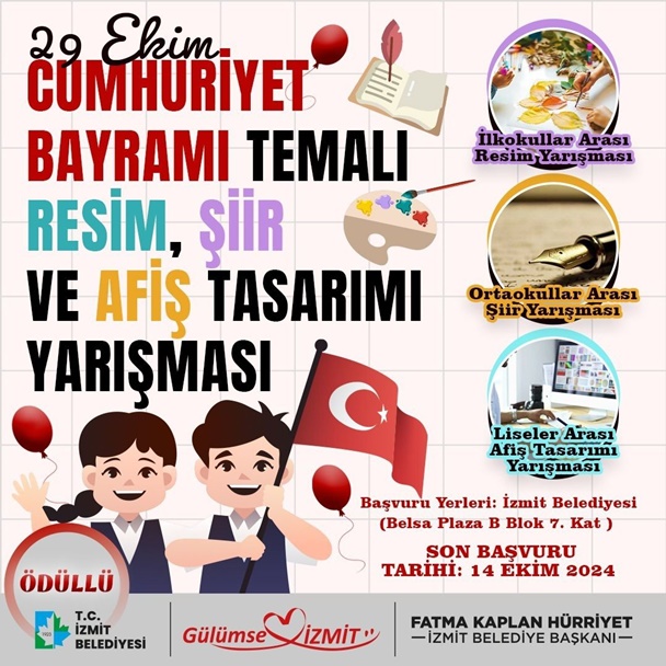 İzmit Belediyesi Kadın ve Aile Hizmetleri Müdürlüğü, 29 Ekim Cumhuriyet Bayramı kapsamında ilkokul, ortaokul ve lise öğrencilerine yönelik ödüllü yarışmalar düzenliyor. Yarışmalar, genç nesillerin Cumhuriyet'in değerlerine olan bağlılıklarını pekiştirmek ve sanatsal yeteneklerini sergilemeleri için önemli bir fırsat sunuyor.