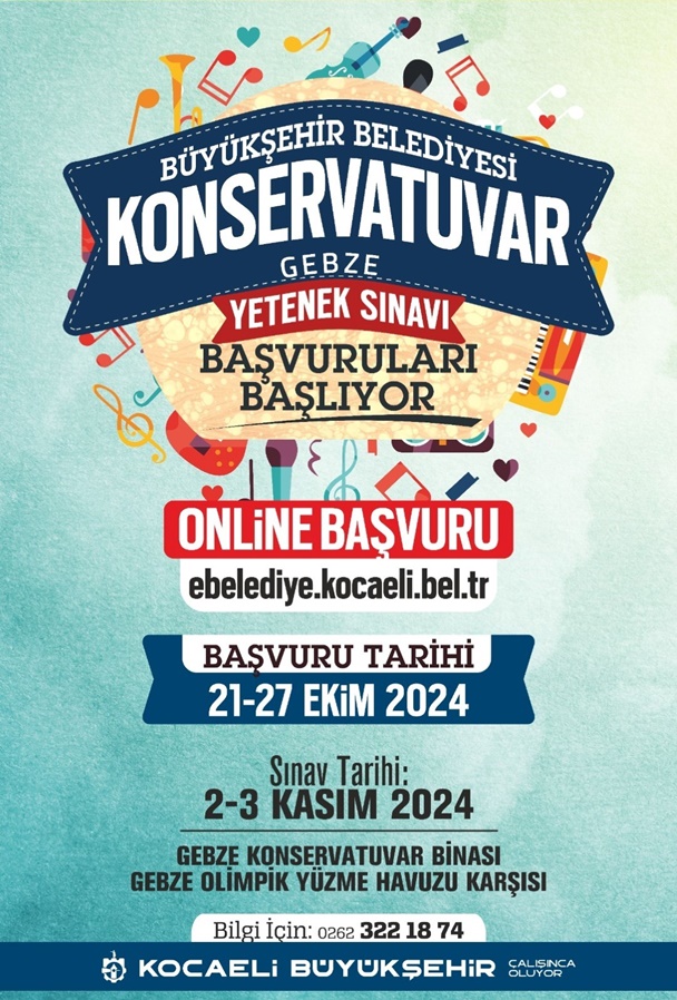 Gebze ilçesinde yapılacak Konservatuvar Yetenek Sınavları; Piyano (7-8 yaş), klasik gitar (10-17 yaş), Batı Keman (8-16 yaş), Bağlama (9-30 yaş), Çocuk Resim (9-16 yaş), Yetişkin Resim (17- 55 yaş) ve Ebru (17-55 yaş) branşlarında yapılacak. Vatandaşlar kendi yaş aralıklarına uyan branşı seçerek sınav başvurularını yapabilecek. Sınavlar 2-3 Kasım tarihleri arasında gerçekleştirilecek. Sınav sonuçları ise 5 Kasım Salı günü Kocaeli Büyükşehir Belediyesi’nin resmi internet sitesi üzerinden açıklanacak. 6-7 ve 8 Kasım tarihleri arasında yetenek sınavlarında başarılı olanlar için kayıt dönemi başlayacak. Dersler ise 11 Kasım Pazartesi günü itibariyle başlayacak.