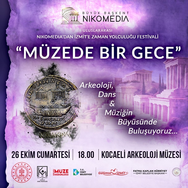 Uluslararası Nikomedia’dan İzmit’e Zaman Yolculuğu Festivali ile İzmit’in zengin tarihi ve kültürel mirasına sahip çıkılmaya devam ediliyor. İzmit Belediyesi Kültür ve Sosyal İşleri Müdürlüğü tarafından hayata geçirilen festival geçtiğimiz ay Derince Gösteri Merkezi’ndeki yapılan Nikomedia Dans gösterisi ile başlamıştı. 8 ay boyunca devam edecek olan festivalin ikinci programı ise 26 Ekim Cumartesi günü saat 18.00’da Kocaeli Arkeoloji Müzesi’nde gerçekleştirilecek.