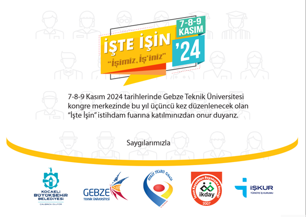 Kocaeli Büyükşehir Belediyesi, Gebze Teknik Üniversitesi, Gebze Ticaret Odası ve İnsan Kaynakları Dayanışma Derneği iş birliğiyle düzenlenen “İşte İş’in 2024” istihdam fuarı, iş arayanlar ile personel arayışında olan firmaları bir araya getirmek üzere düzenleniyor. Etkinlik hakkında detaylı bilgilere www.isteisin.com adresinden ulaşılabilir.